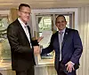 MILEPÆL: Kjell-Ove Skare, programdirektør ASBM hos Space Norway og Jeremy Novosad, Director of Programs, Space Systems Sector hos Northrop Grumman markerer at testene er gjennomført og vellykkete, og at satellittene nå overleveres til Space Norway.